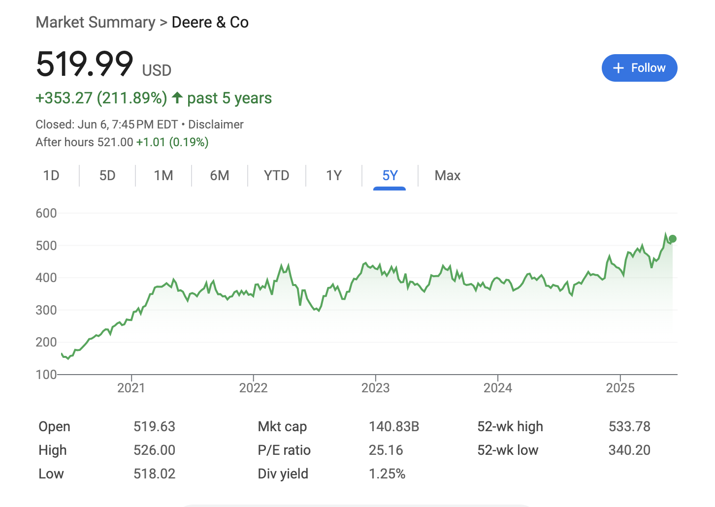 I was aware that John Deer sells machines for lawn care, and they also have some cool hats, but I wasn't aware they have four segments: Production and Precision Agriculture, Small Agriculture and Turf, Construction and Forestry, and Financial Services. There's more information on the yahoo description.