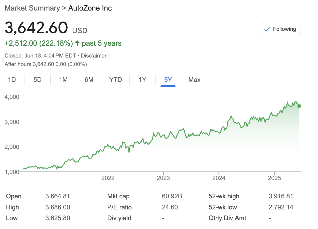 Entry point for AutoZone is pretty high right now for the stock at $4,322 @top but the man if I had the money to spend. I would have purchased a share at $3,642. That's like a 700 dollar (~20%) difference man within a few months.
