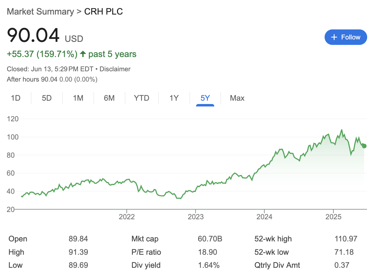 While driving around town, I noticed Montrose was under construction. One of the giant "pipe blocks" lying around on the street had the name "CRH" spray-painted on it. After doing some digging, I found the stock ticker and started doing some research.