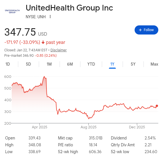 Interesting enough... When I posted a note about doing a write up on United Healthcare, the stock was at all time highs but most recently within the past six months. There's been a huge drop in the stock price around April of Last year. Looks like the stock has been attempting to recover. This could have to do with the media coverage of the Luigi trial but more than likely this could have to do with the swift change of leadership as a result. The PE is 18.11 and EPS is 19.20 with a stable beta of .43 @TOP.