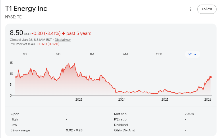 Located in Texas, T1 Energy appears to have missed several targets for EPS but the Analyst Price Targets are around $10.50 compared to it's current $8.50 @TOP. EPS is -1.32 and the beta is 1.57 so there's some volitility here. Most recently there appears to be a buzz around the company but has it maxed out it's juice or is it just primed to run? Peak the company sat at $15 per share so the upside potential is 1.5x. Something to keep an eye on.