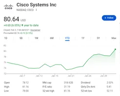Year over year Cisco is up 33%. If you put 1000 dollars into cisco a year ago, it would be worth 1300 dollars today. The beta .87 so this is very stable and not meme stock status. The PE Ratio is 31.14 and EPS is 2.59. These are fairly stable numbers. Cisco has met investor expectations during investor calls the past 4 quarters by beating targets and has an expected target of 86 a year from now.